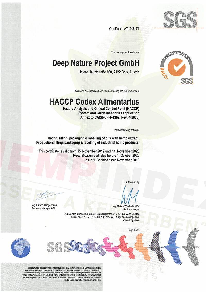 A HACCP tanúsítás egy újabb bizonyíték a megfelelő biztonságú és minőségű Medihemp termékek gyártására és forgalmazására. Ennek a nemzetközi szabványnak a fő alapelvei: a termékeket fenyegető fizikai, kémiai és biológiai veszélyek vizsgálata, a kritikus ellenőrzőpontok kialakítása, határértékek, javító és ellenőrző intézkedések megállapítása, dokumentumok és jegyzetek létrehozása.